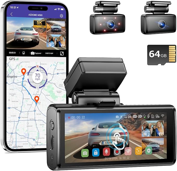 AZDOME M580 3 Channel 5K Dash Cam, 5G WiFi Dash Camera for Car with 64GB Card, Front and Rear Inside 4K+1080P+1080P, IR WDR Night Vision, 4" Touchscreen GPS 24H Parking Mode G-Sensor Loop Recording